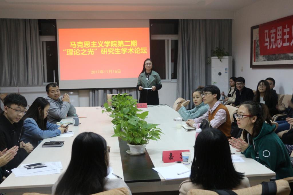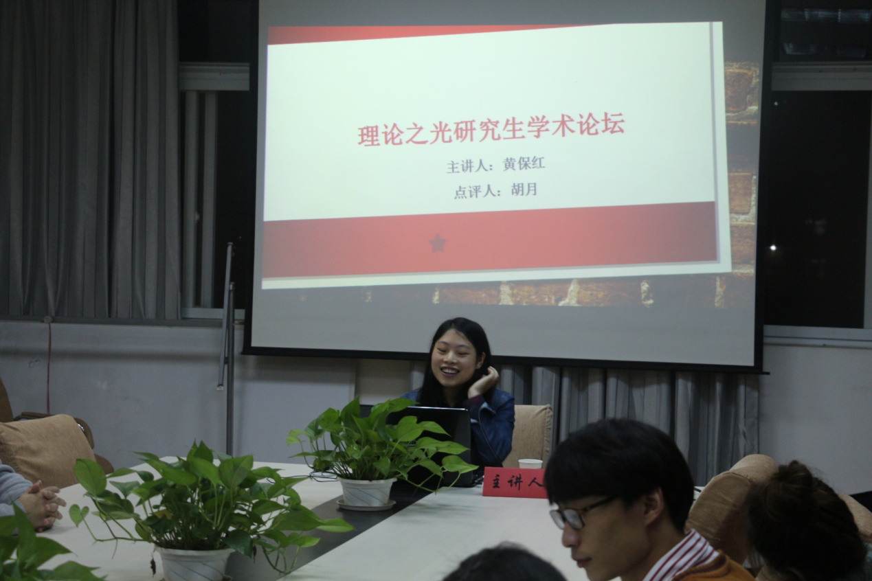 2017年11月16日晚七点,beat365英国官方网站第二期“理论之光”研究生学术论坛如期举行。beat365英国官方网站2015级硕士研究生杨静、黄保红作为本期论坛的主讲人,卢微、胡月担任本期论坛的特邀嘉宾。