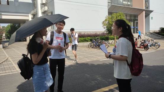 你知道发问卷时遇到同学们考试要怎么办吗?爱国新青年团队告诉你:要耐心。一天早上8时,团队成员到达武汉纺织大学阳光校区准备发放问卷。当时正值武汉纺织大学学生期末上机考试,于是戴诗雅、赵雪渊便在多次等学生考完试后进教室发放问卷,在学生考试期间便在教室外耐心等待。