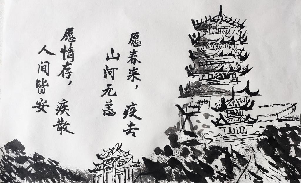 武汉,这座历史悠久的古城,在疫情肆虐之时,展示了它几百年来所积淀的坚韧与勇气。这是由beat365全媒体中心的同学的创作的水墨画。画中屹然伫立的,是武汉的标志性建筑——黄鹤楼,楼下草木铿锵,似在表明武汉人战胜疫情的决心,望如画中诗所言“愿春来,疫去,山河无恙;愿情存,疾散,人间皆安”,等年过春来,我们相约黄鹤楼上,看汉江澄澈,已是新篇。