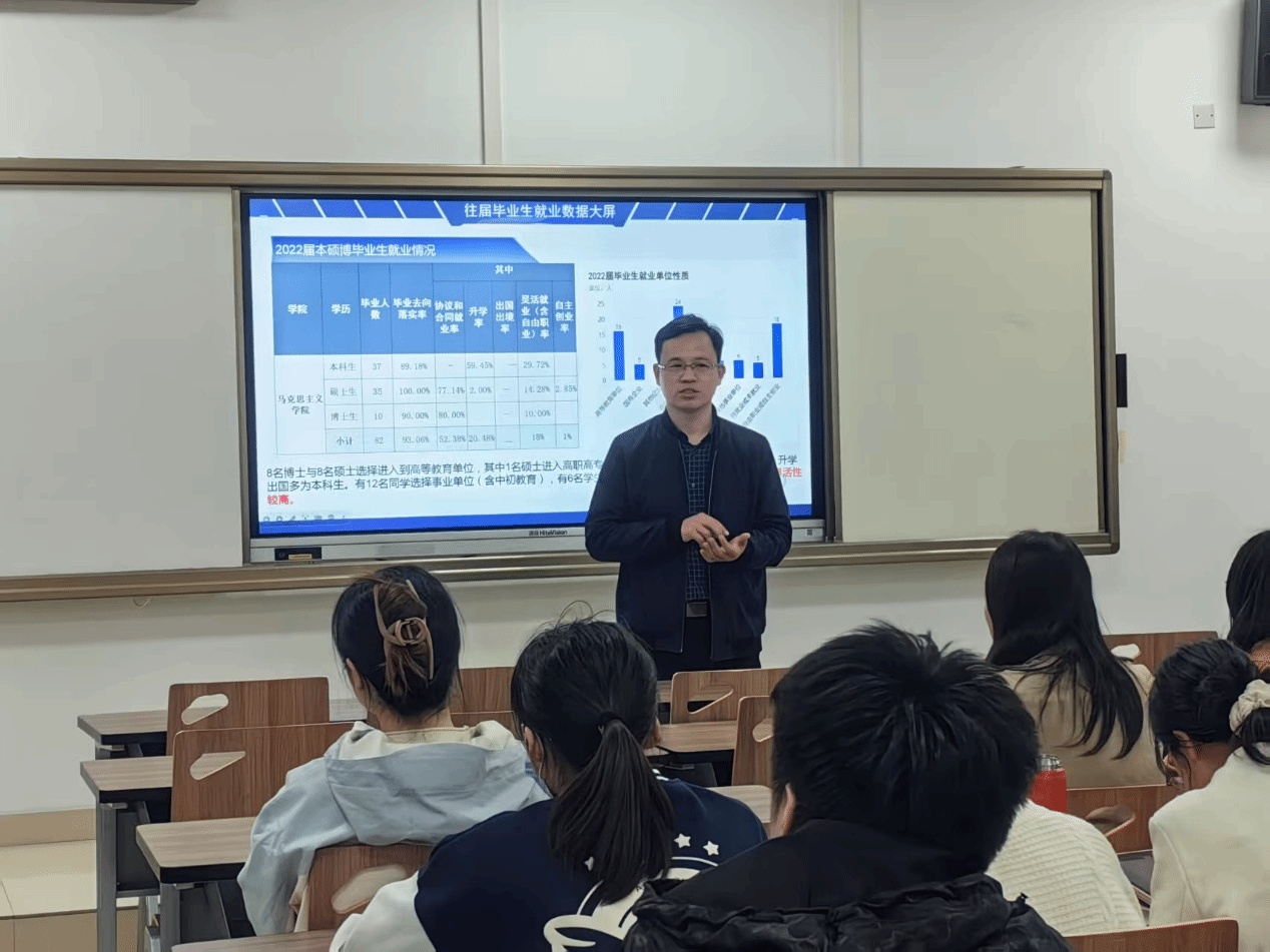 会上,姚晟首先就学院当前的就业整体情况进行了介绍,通过历年就业数据和去向分布,展现出多元的就业路径。他指出,当前同学们在择业过程中普遍存在“路径依赖”,部分同学将目光过度集中于考研深造或进入机关单位,忽视了广阔的社会就业空间。姚晟鼓励同学们放宽视野,积极探索多类型、多层级的就业机会,把个人职业发展融入国家战略和社会需求之中。