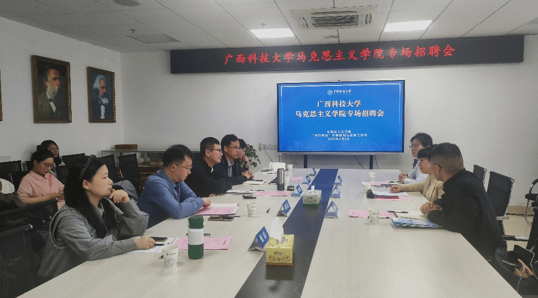 2025年4月8日,广西科技大学beat365英国官方网站党委书记覃雪梅,党委副书记、纪委书记夏辛萍,副院长梁炳辉来beat365宣传招聘。beat365党委书记魏海勇,党委副书记、纪委书记武彦斌,副院长李海金,思想道德与法治教研部主任张洁,思想政治教育系主任李胜蓝以及博士生代表参加专场招聘会。副院长李海金主持会议。