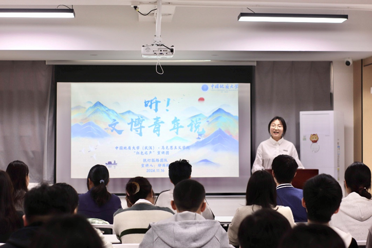 此次宣讲人郑雨欣的宣讲主题为《听!文博青年说》,讲述了文博青年在建设社会主义文化强国,推动文化现代化进程中所做的贡献,同时依托我校“逸夫博物馆+秭归实习基地”大思政课实践教学平台以及“红绿蓝”大中小学思政课一体化共同体建设项目作为案例补充,呼应着习近平总书记在湖北探访云梦博物馆的时政热点。