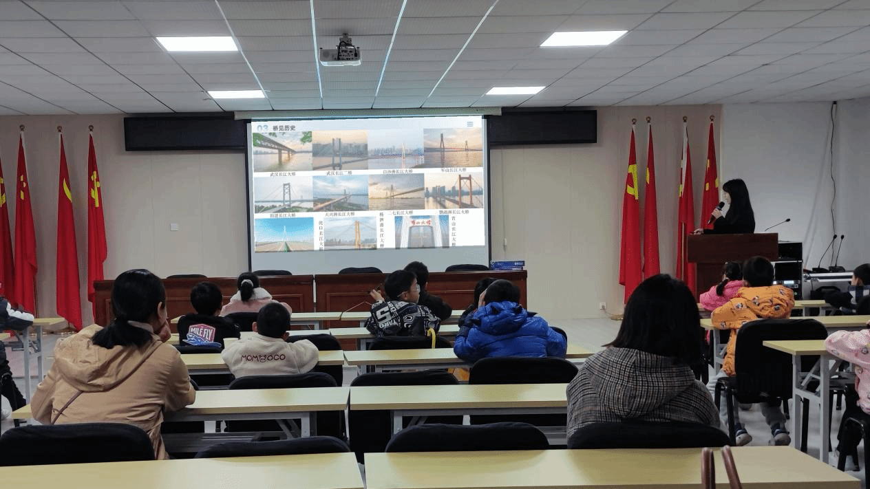 其次,主讲人唐丽媛将号称“桥梁之都”的武汉的桥梁建设历程作为本次宣讲重点。从清朝张之洞的构想到新中国成立后武汉长江大桥的落成,主讲人结合历史影像与数据,讲述了这座“万里长江第一桥”的艰辛建设史。1957年,武汉长江大桥以“一桥飞架南北,天堑变通途”的壮举,不仅贯通了南北交通,更标志着中国桥梁技术从“跟跑”迈向“自主创新”的里程碑。现场播放的短视频展示了武汉十一座跨江大桥的雄姿,小朋友们深刻感受到桥梁建设对城市发展、经济融合的深远影响。