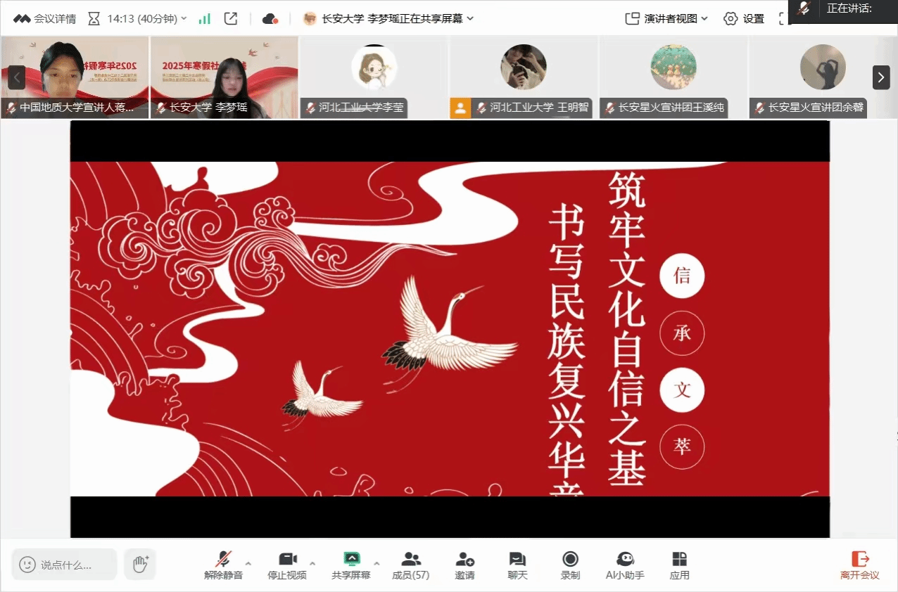 宣讲结束后,同学们纷纷表示,通过此次活动,他们对文化自信有了更加全面和深入的理解,也更加坚定了为实现中华民族伟大复兴的中国梦贡献青春力量的决心beat365英国官方网站(武汉)beat365英国官方网站“信承文萃”团队的此次线上宣讲活动,不仅为同学们提供了一个学习和交流的平台,更是一次精神的洗礼和思想的升华。在新时代的征程上,让我们携手同行,共同筑牢文化自信之基,书写民族复兴的华章。