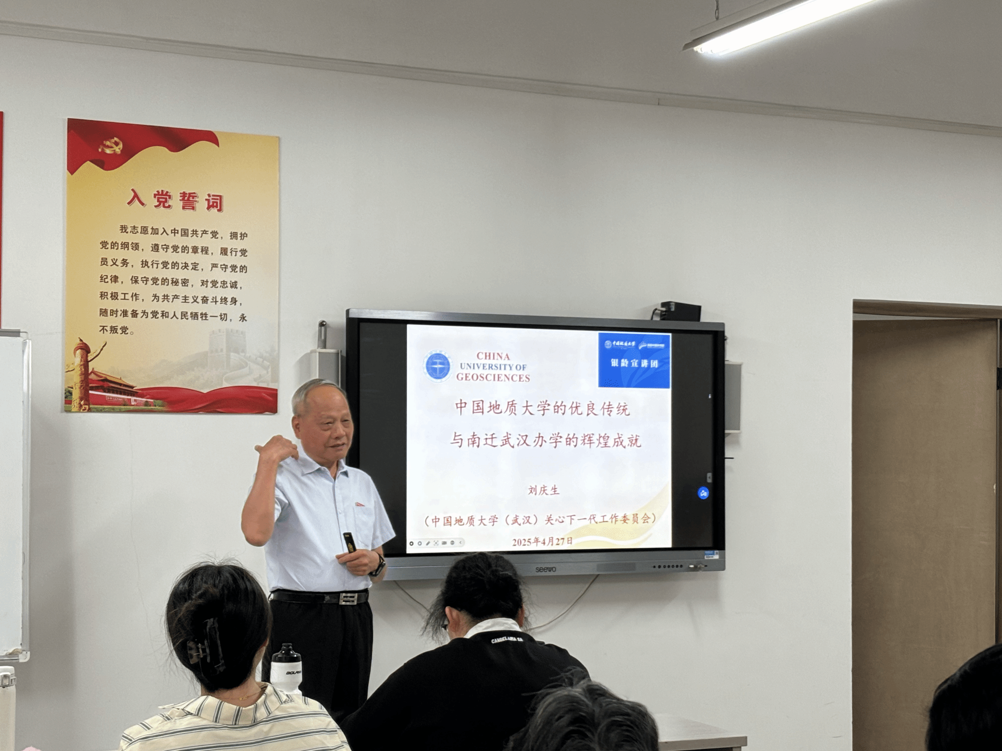 随后,beat365英国官方网站关工委委员、“银龄宣讲团”成员刘庆生老师深情讲述beat365英国官方网站的优良传统以及南迁武汉办学的辉煌历程。从地质先驱“以献身地质事业为荣”的誓言,到南迁时期师生共克时艰的奋斗故事,刘老师用鲜活的历史案例诠释了地大人“艰苦朴素、求真务实”的精神内核,现场听众无不动容。