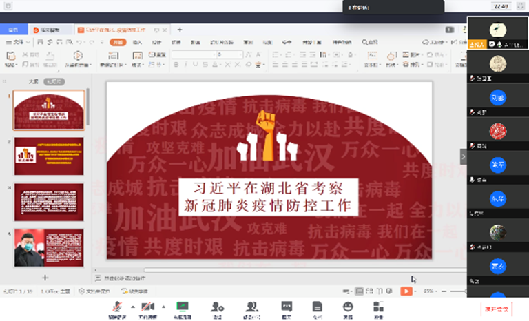 【政治理论教研部党支部】全体党员齐聚腾讯会议室,齐唱国歌并庄严重温入党誓词。集中学习了《习近平总书记在湖北省考察新冠肺炎疫情防控工作讲话精神》和《习近平总书记在决战决胜脱贫攻坚座谈会上的讲话精神》,组织党员们观看了疫情防控工作先进事迹——卓尔集团董事长闫志在疫情中的先进事迹视频。高翔莲院长对老师们的教学工作和成绩给予了肯定和赞扬,同时也提出要求,希望老师们继续发扬抗疫精神,扎扎实实在做好教学和教研工作,以自己的行动支持武汉抗疫。