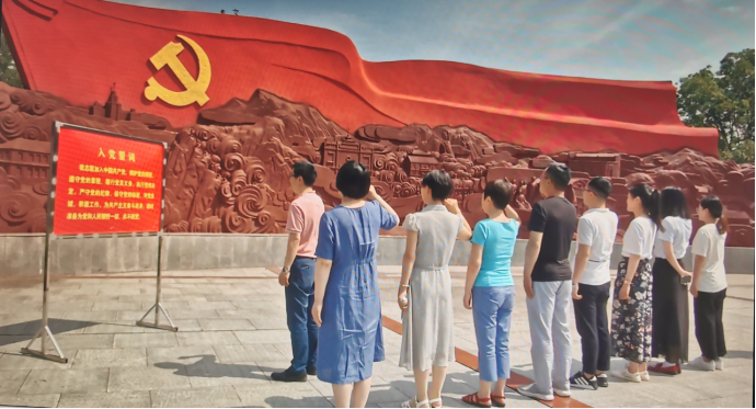 在陈潭秋纪念广场鲜红的党旗下,思想政治教育系党支部书记严世雄同志带领全体党员重温入党誓词,誓言坚定响亮。