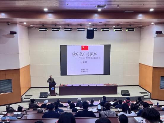 王宗廷教授以“修而改之以致胜”为题分享了学习党的二十大审议通过的《中国共产党章程(修正案)》的体会,从党章的概述入手,结合历史梳理了党的二大以来十八次党章修正、修订、修改的过程,深入浅出、浅显易懂地阐释了党章修改的依据、修改的内容以及修改后的时代价值体现,并对今后如何学习领会贯彻党章谈了几点学习体会:一是提高对党章、党章修改的认识,深刻认识党章修改的重大意义,增强思想政治自觉,服务国之大者;二是在全面把握上下功夫,要发展地而不是静止地、全面地而不是片面地、系统地而不是零散地、普遍联系地而不是单一孤立地理解党章修改的精神实质,实现理论与实践的良性互动;三是守正创新呈特色,将学习政治报告与新党章相结合、学习与辅导交流研讨相结合、自学与组织学习相结合、学习与工作相结合、继承与创新相结合。