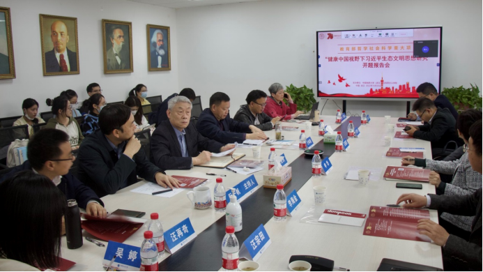 王林清致辞。王林清表示,在全国上下深入学习贯彻党的二十大精神和地大喜迎七十年校庆之际,召开黄娟教授支持的“健康中国视野下习近平生态文明思想研究”开题报告会具有重要意义。王林清指出,本重大课题的研究以为党为国家工作大局服务、为繁荣发展哲学社会科学服务为宗旨,有助于推动习近平生态文明思想和习近平关于健康中国论述等方面的研究创新,有助于推动当代中国马克思主义和二十一世纪马克思主义的新发展,希望课题组在研究过程中始终坚持正确导向,坚持与时代同步,深入研究,多出大作,多出精品,推动项目顺利实现预期目标。