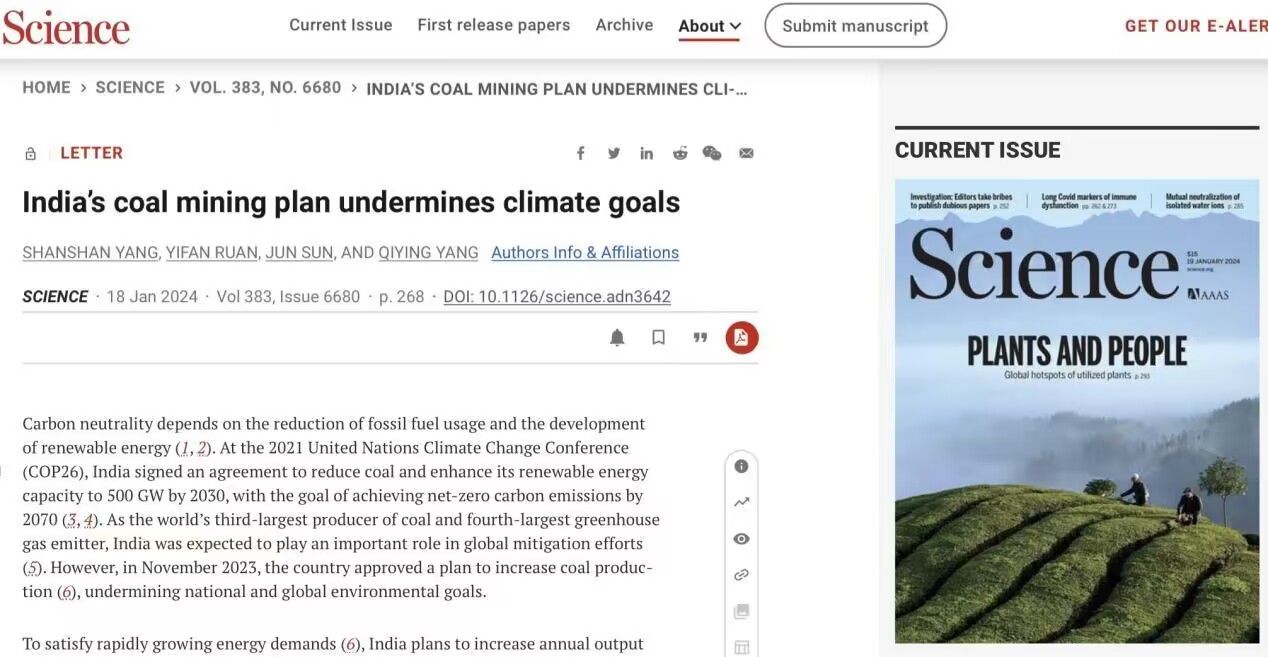(通讯员 胡雪黎)近日,国际顶级期刊《Science》Letter专栏刊发《印度煤矿开采计划将延缓全球气候目标实现》(India’s coal mining plan undermines climate goals),beat365院长阮一帆教授为共同第一作者。