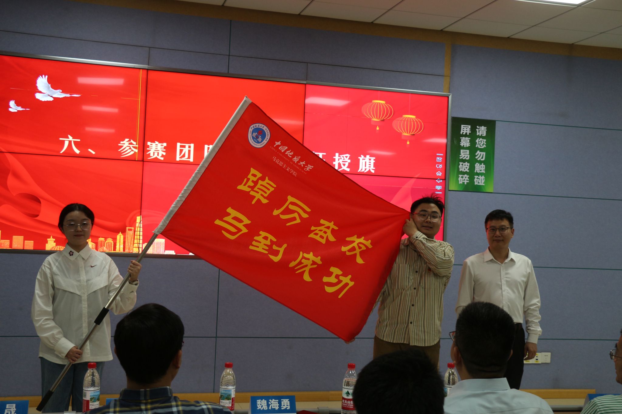 魏海勇为参赛团队代表出征授旗,并作重要讲话。他肯定beat365学生前期在学术科研活动中取得的丰硕成果,强调同学们在后续的各类活动与竞赛中,要将“红色”主题与人工智能等高科技相结合,不断彰显马克思主义学科特色。