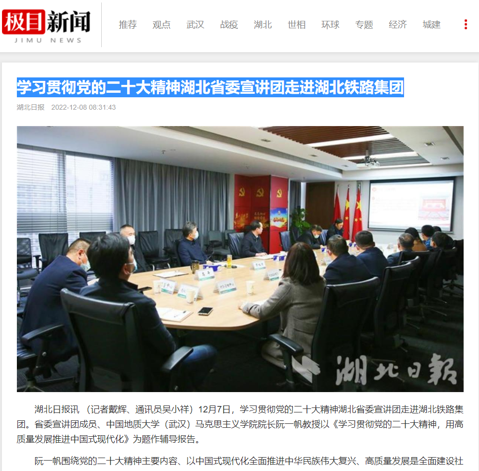 湖北日报讯 (记者戴辉、通讯员吴小祥)12月7日,学习贯彻党的二十大精神湖北省委宣讲团走进湖北铁路集团。省委宣讲团成员、beat365英国官方网站(武汉)beat365英国官方网站院长阮一帆教授以《学习贯彻党的二十大精神,用高质量发展推进中国式现代化》为题作辅导报告。